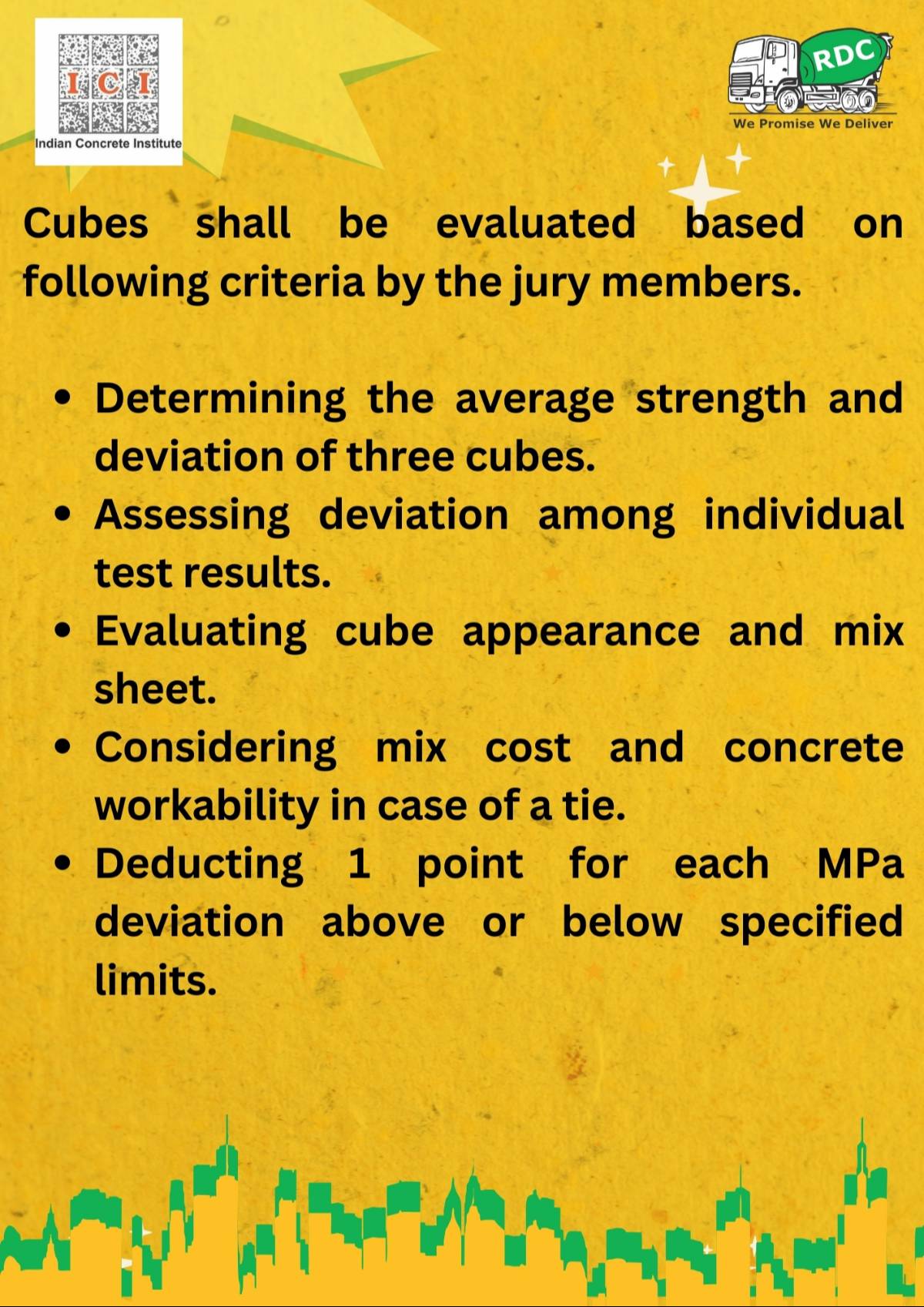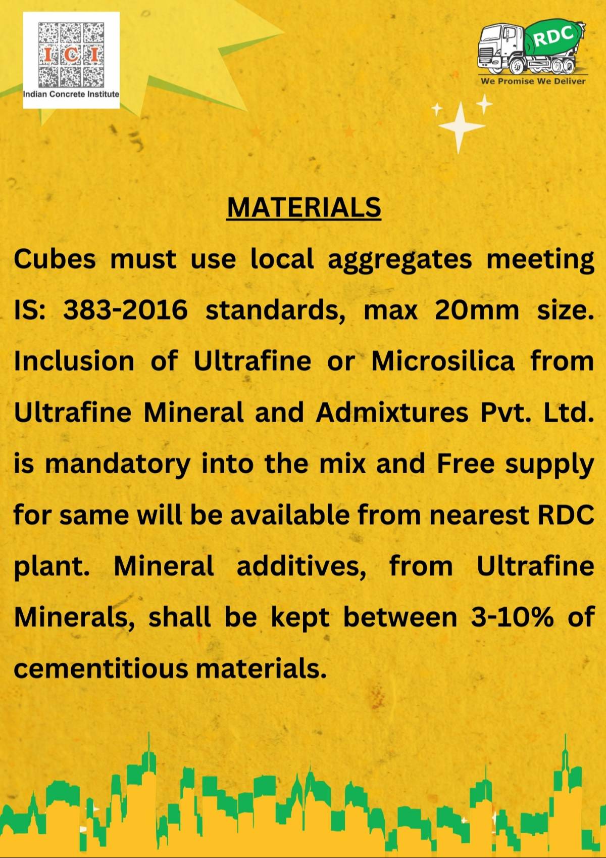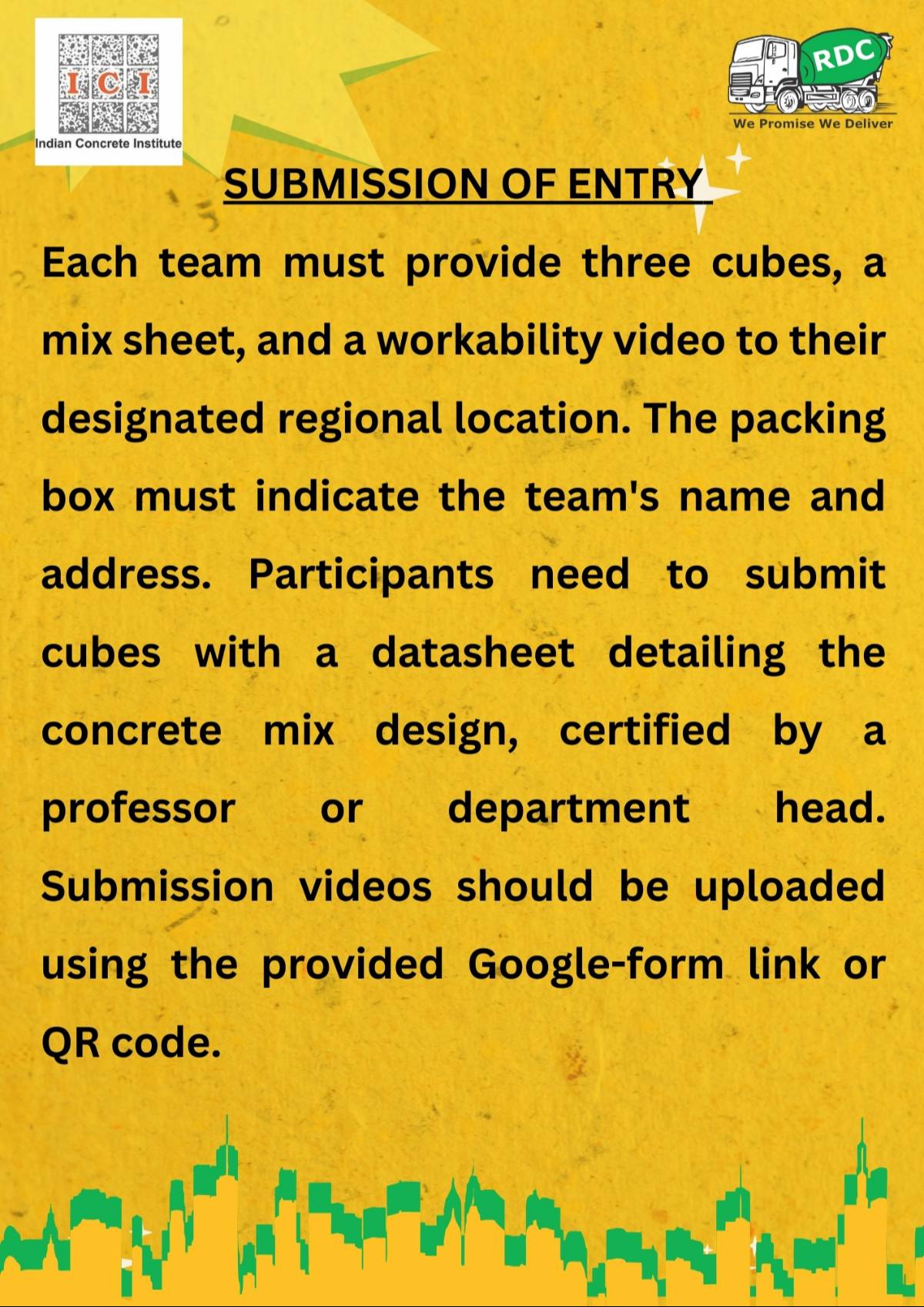 -Participants need to submit cubes with a datasheet detailing the concrete mix design, certified by a professor or department head.
