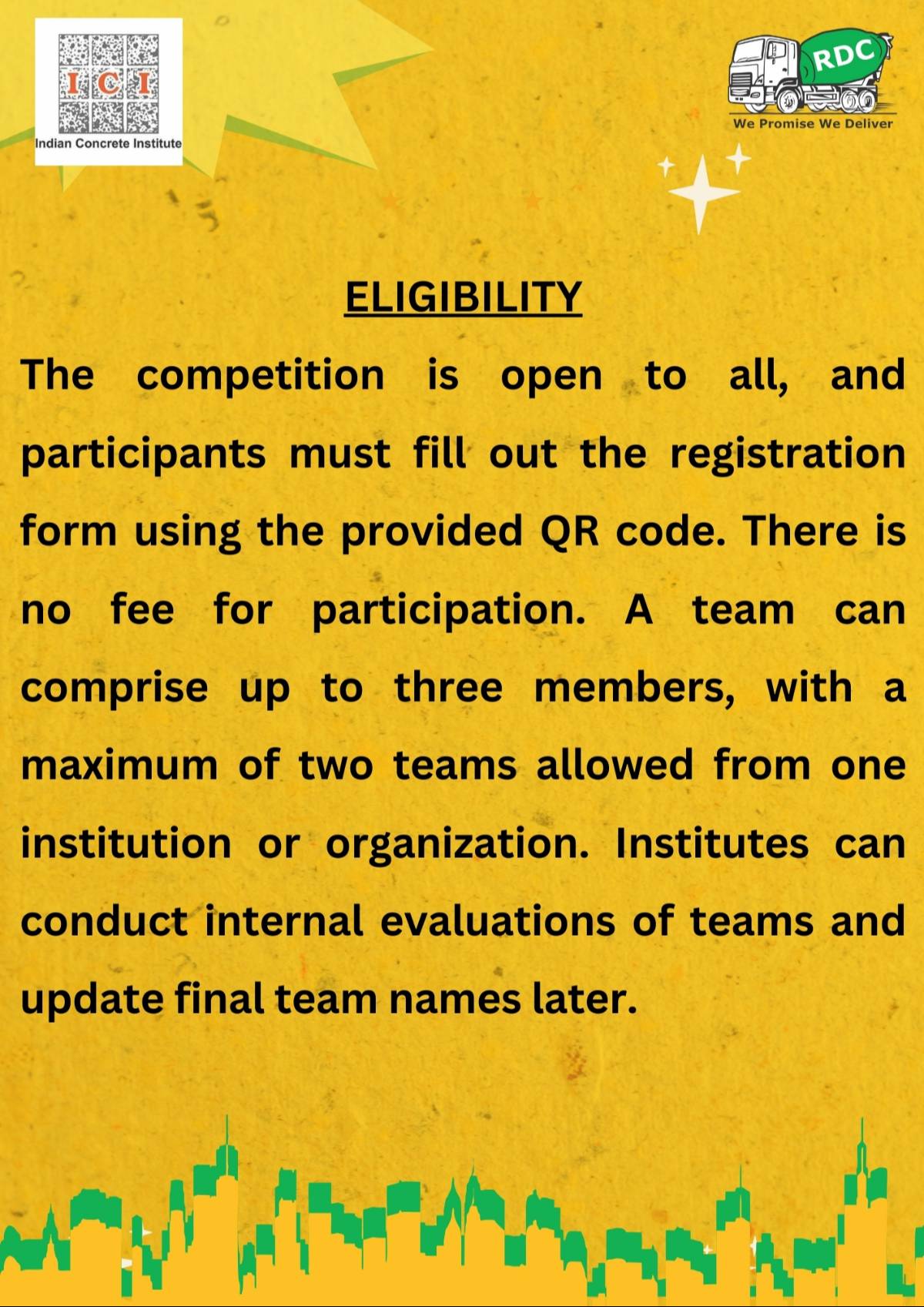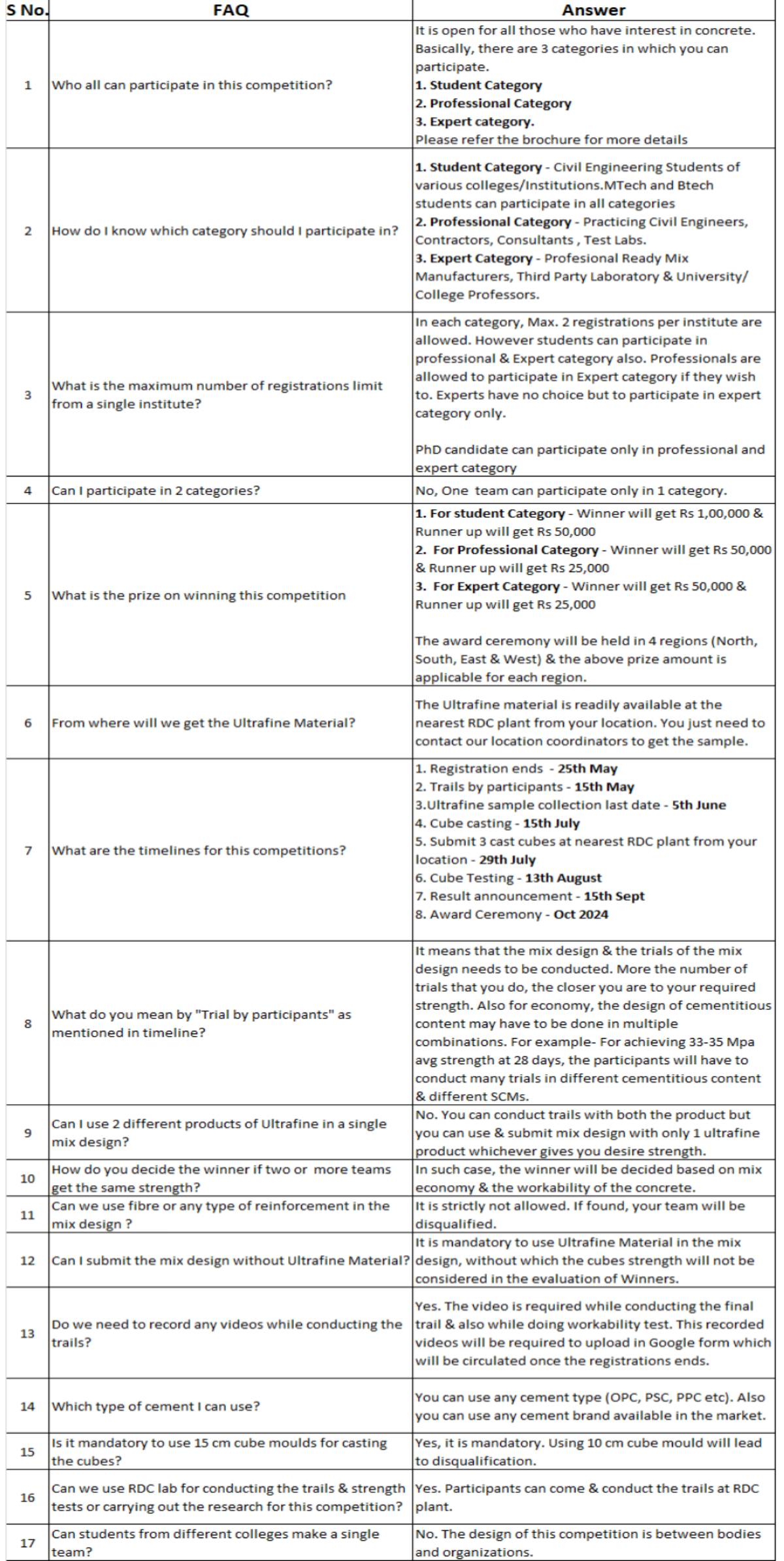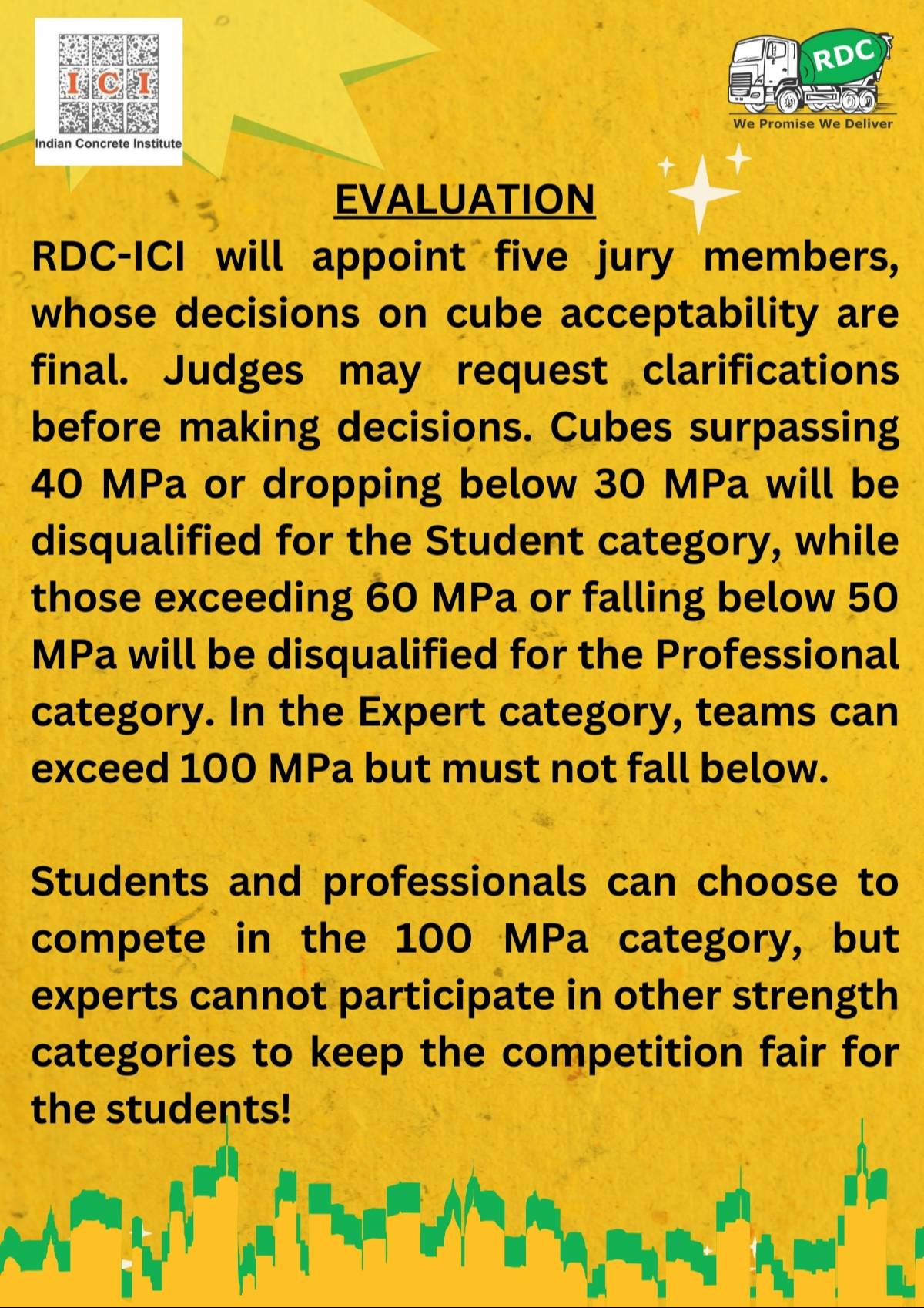 -Participants need to submit cubes with a datasheet detailing the concrete mix design, certified by a professor or department head.