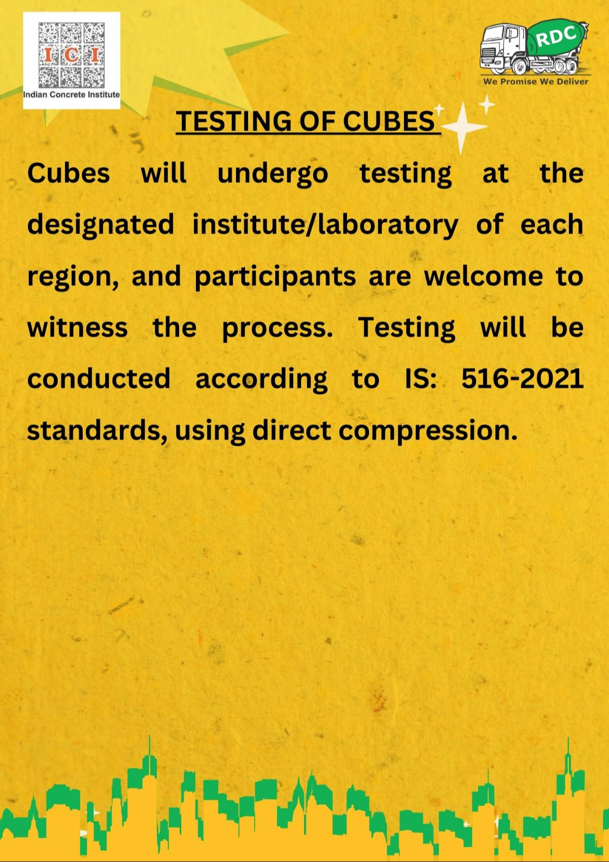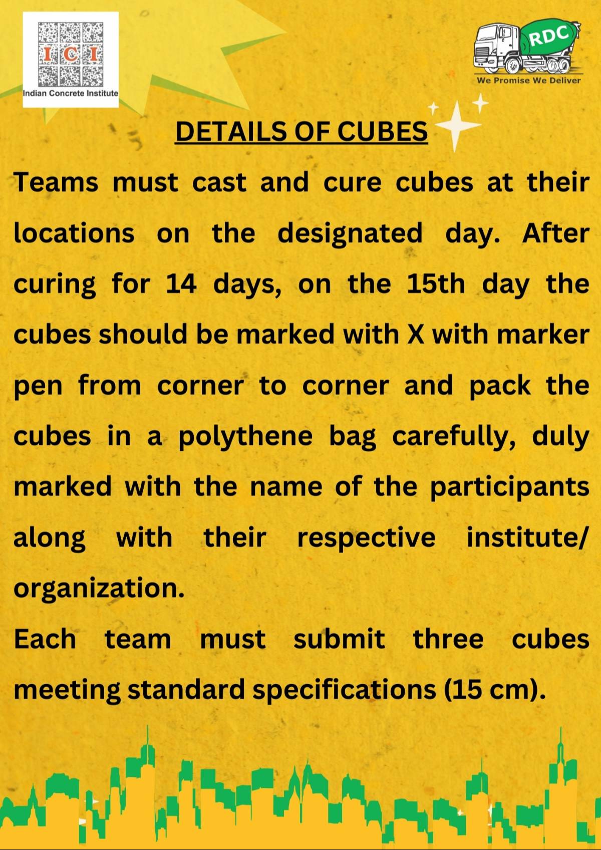 -Teams must cast and cure cubes at their locations on the designated day. After curing for 14 days, on the 15th day the cubes should be marked with X with marker pen from corner to corner and pack the cubes in a polythene bag carefully, duly marked with the name of the participants along with their respective institute/ organization.