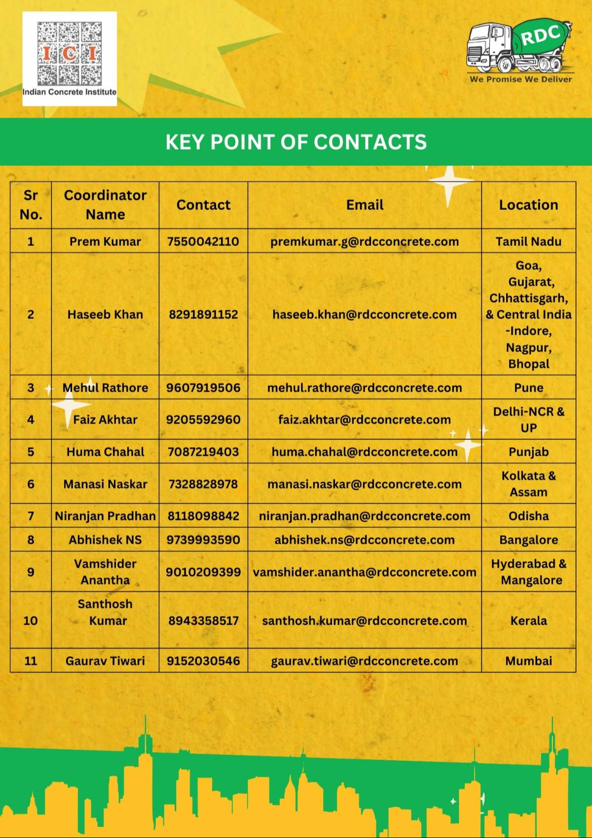 | 11 | Gaurav Tiwari | 9152030546 | gaurav.tiwari@rdcconcrete.com | Mumbai |